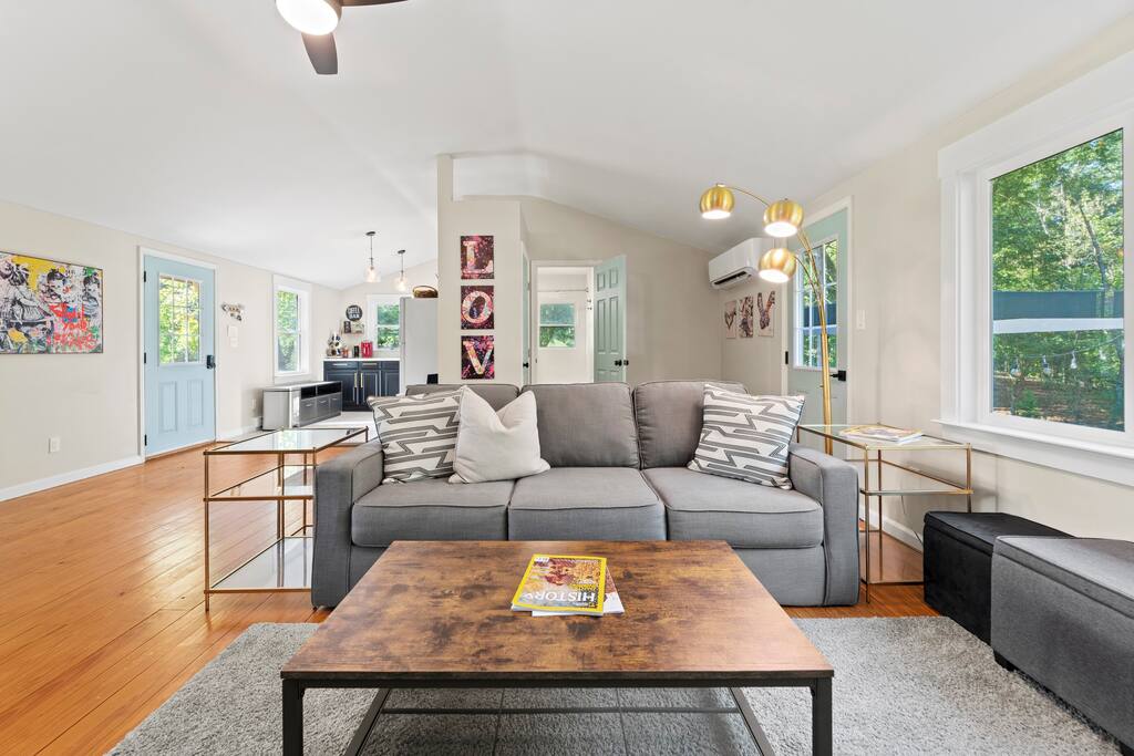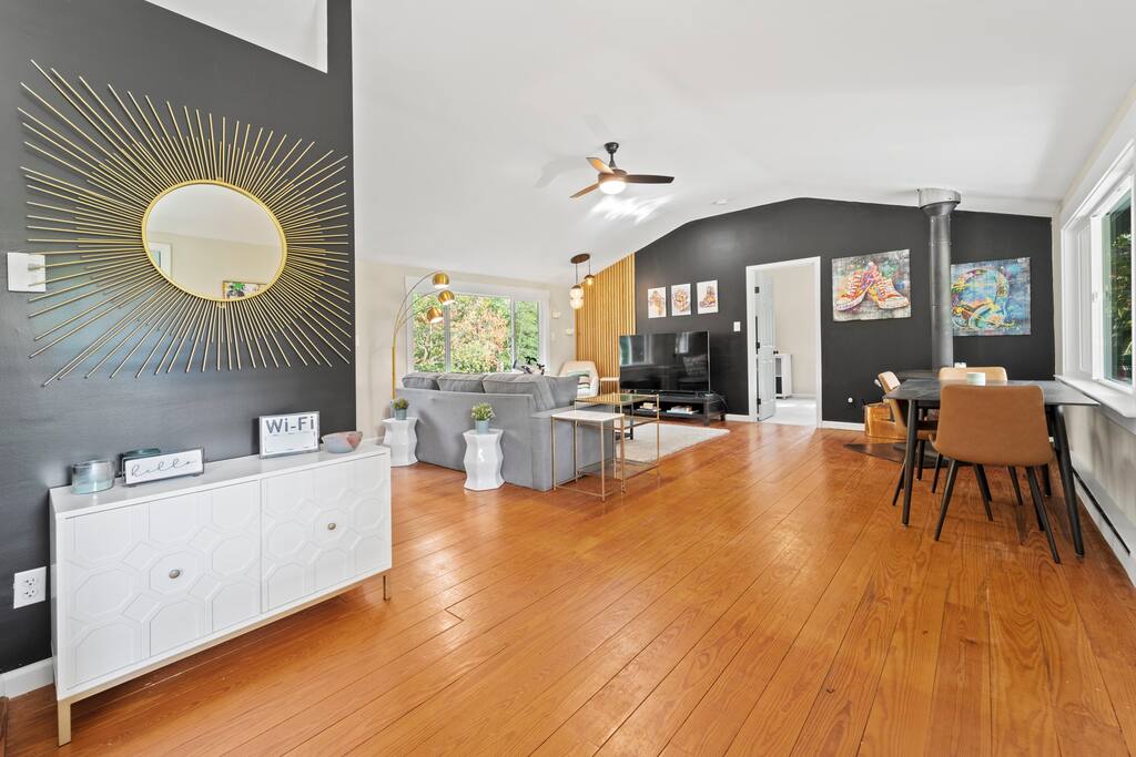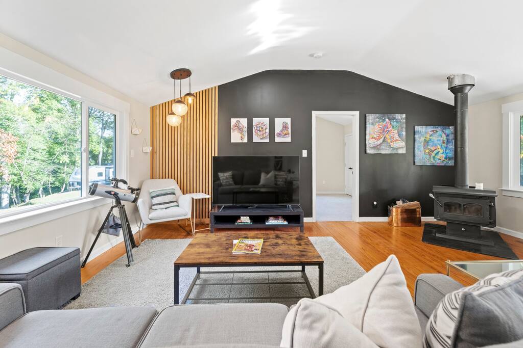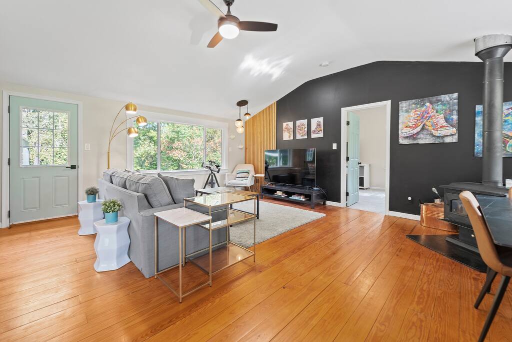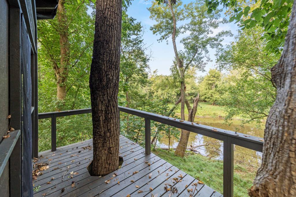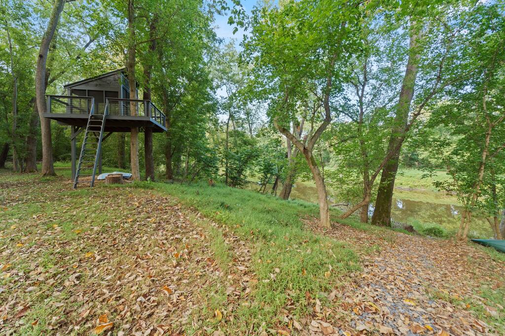 Welcome to our tranquil River House Retreat! Immerse yourself in stylish comfort with a unique treehouse, kayaks, patio for lunches out in the yard and a relaxing hot tub.